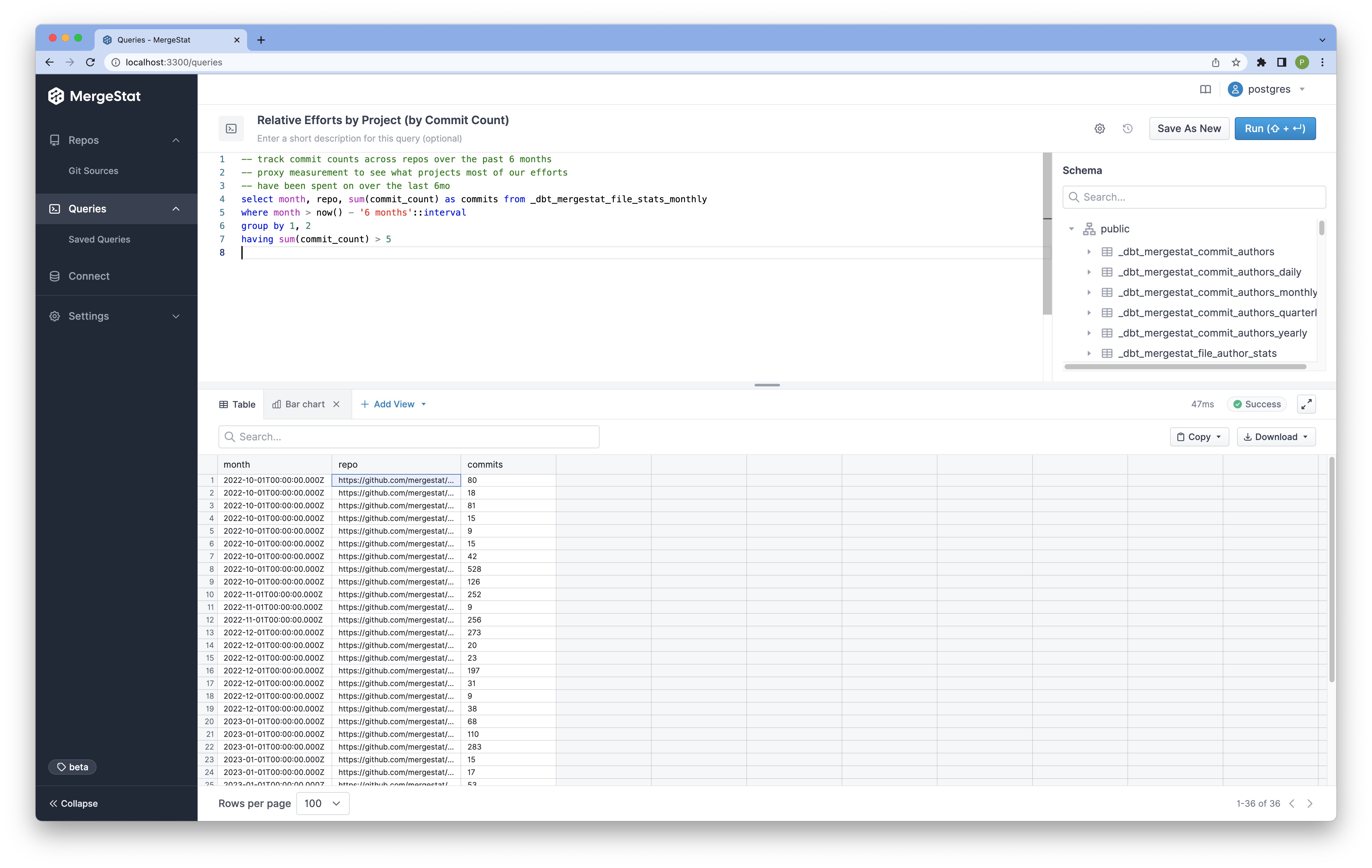 By looking only at git commits (and associated file changes), we can answer some interesting questions. MergeStat makes this raw data accessible through SQL for ad-hoc querying. In addition, tools such as dbt can be used to define models on top of this raw data for easier use in downstream reporting and analytics.